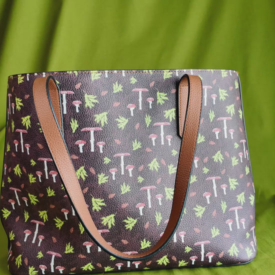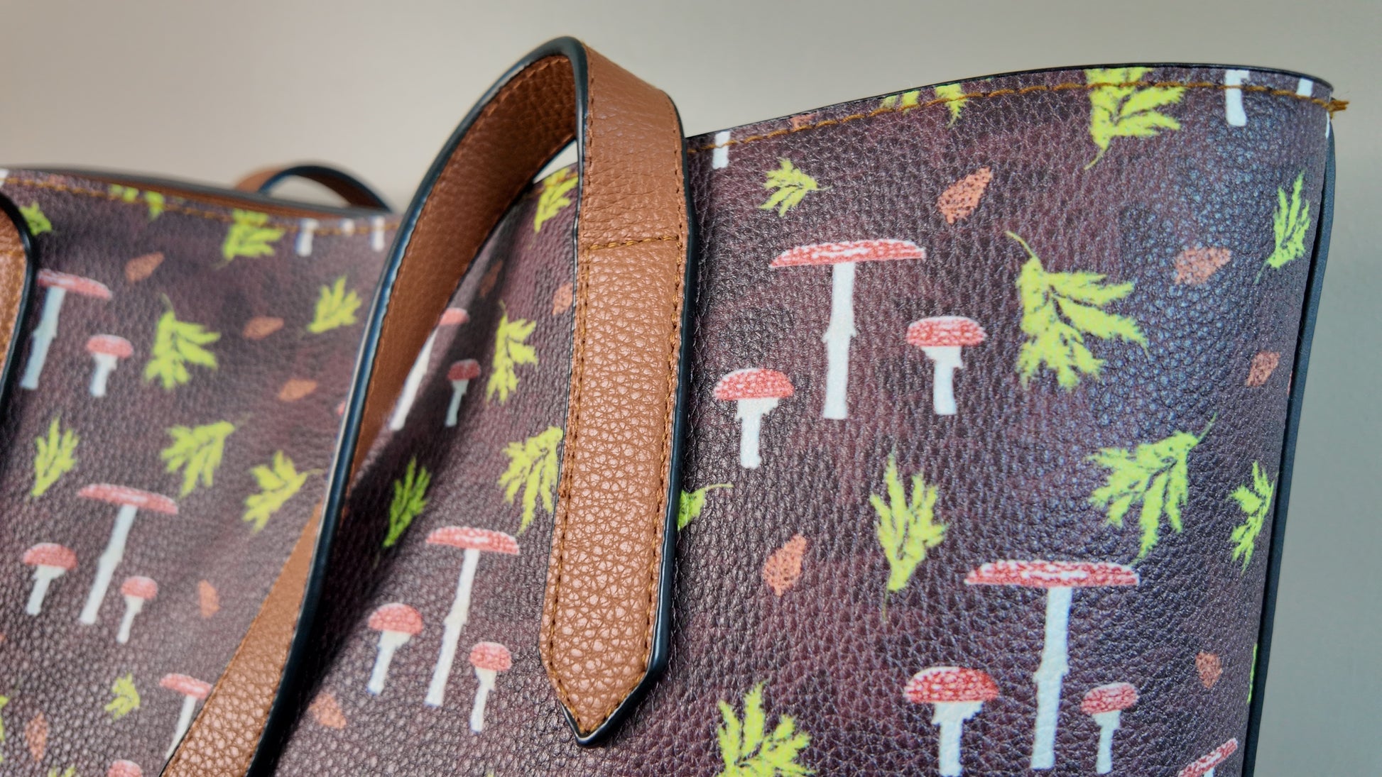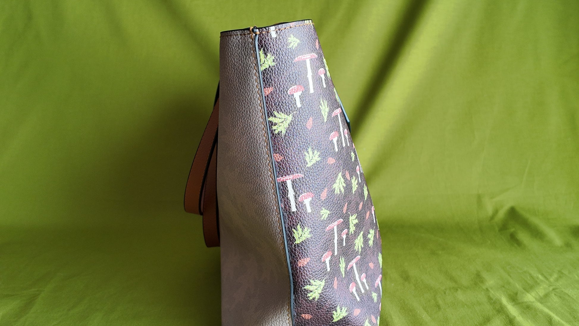 The front of the bag is printed with my Mighty Mushroom print in the dark colourway. The back is printed with a coordinating print with oak leaves. If you would prefer the same print on the front and back, reach out to me. I'm always happy to design a product to meet your unique tastes.